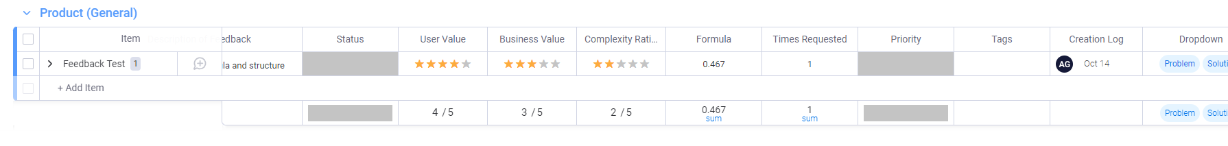 AVERAGE(({User Value}*0.2),({Business Value}*0.4),({Complexity Rating}*0.4))*({Times Requested}*0.5)