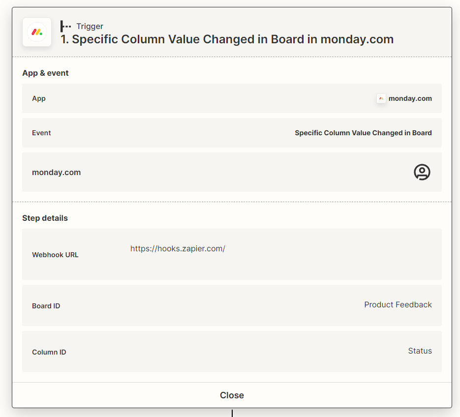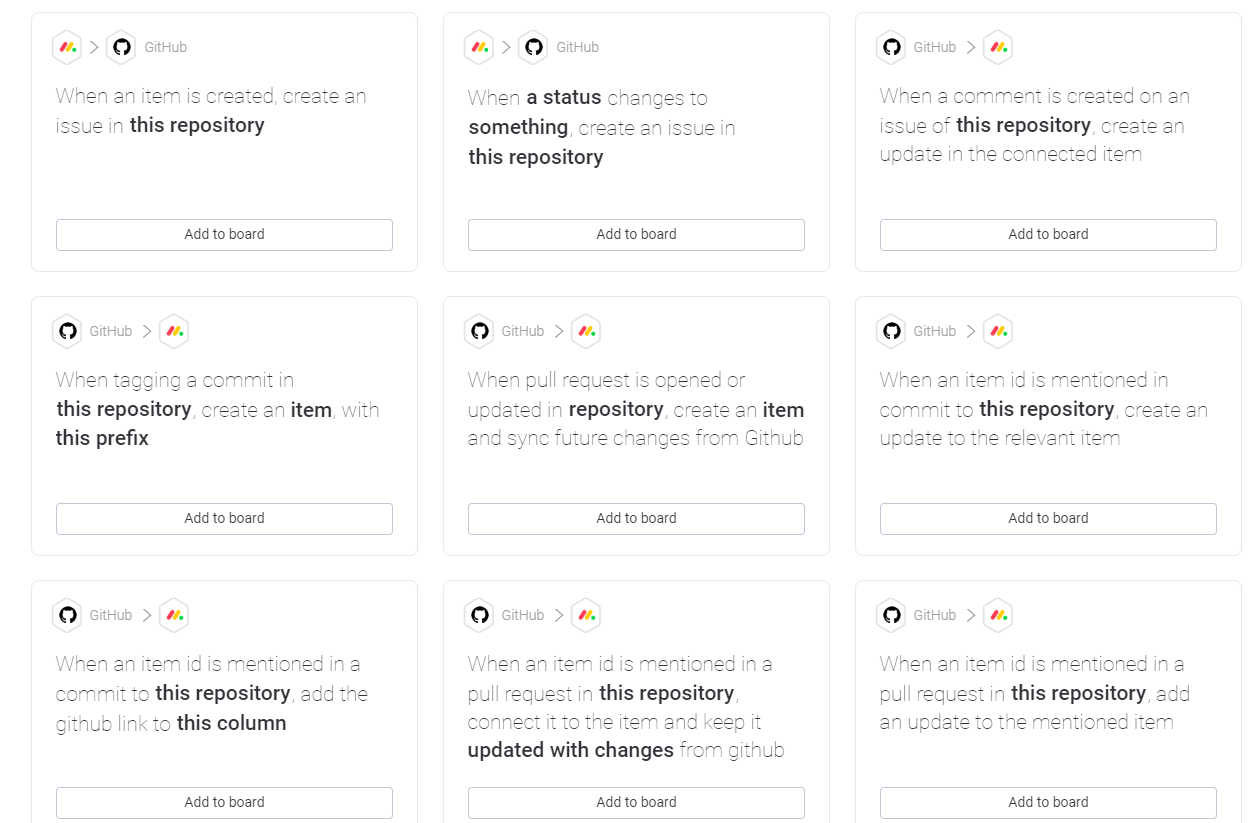 A workaround is to use a workflow automation tooled such as Zapier. Zapier can help us create web-hooks, making it easy to send information from one platform to another. Better, we can choose and configure what information is sent from Monday to say GitHub.